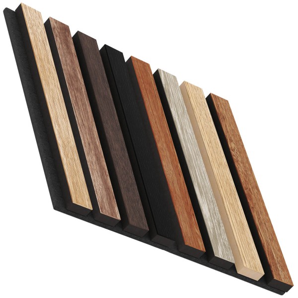 Die 60 x 240 cm großen, furnierten Akustikpaneele werden aus umweltfreundlichen Materialien hergestellt. Die Paneele haben akustische Eigenschaften und können in verschiedenen öffentlichen Räumen, z. B. Büros, sowie in Wohngebäuden verwendet werden. Sie können sowohl an Wänden als auch an Decken angebracht werden. Der 7 mm dicke Filz, der in schwarzer oder grauer Farbe erhältlich ist, wird durch Recycling von Kunststoffen gewonnen. Die Lamellen bestehen aus einseitig furnierten, 12 mm dicken schwarzen MDF-Leisten. Die MDF-Latte ist 2400 mm lang und 27 mm breit. Die schwarzen MDF-Latten sind unbehandelt furniert (nicht geölt) und in mehreren modischen Farben erhältlich. Der Abstand zwischen den Lamellen beträgt 13 mm.
