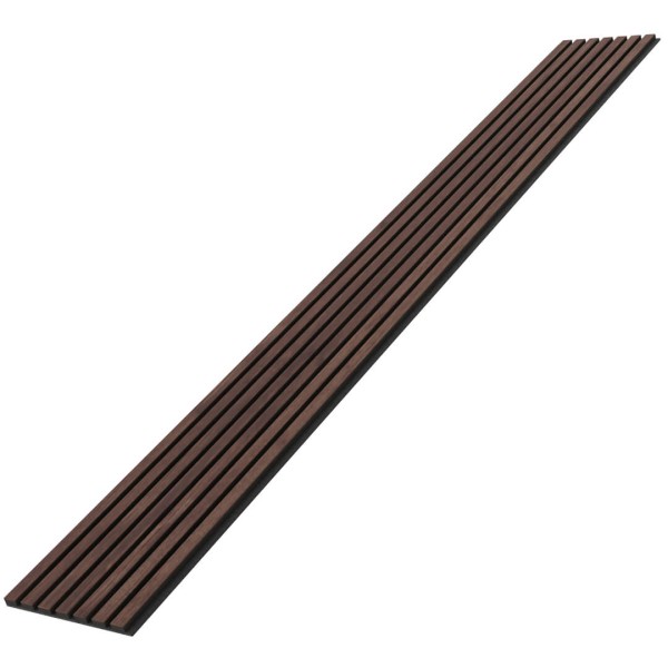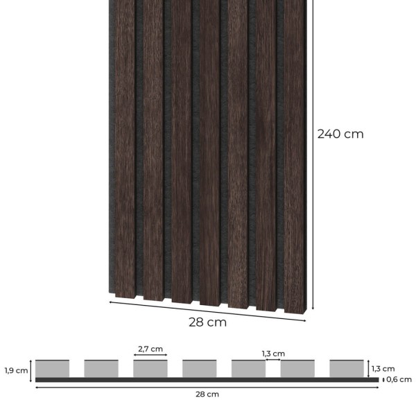 Die 60 x 240 cm großen, furnierten Akustikpaneele werden aus umweltfreundlichen Materialien hergestellt. Die Paneele haben akustische Eigenschaften und können in verschiedenen öffentlichen Räumen, z. B. Büros, sowie in Wohngebäuden verwendet werden. Sie können sowohl an Wänden als auch an Decken angebracht werden. Der 7 mm dicke Filz, der in schwarzer oder grauer Farbe erhältlich ist, wird durch Recycling von Kunststoffen gewonnen. Die Lamellen bestehen aus einseitig furnierten, 12 mm dicken schwarzen MDF-Leisten. Die MDF-Latte ist 2400 mm lang und 27 mm breit. Die schwarzen MDF-Latten sind unbehandelt furniert (nicht geölt) und in mehreren modischen Farben erhältlich. Der Abstand zwischen den Lamellen beträgt 13 mm.