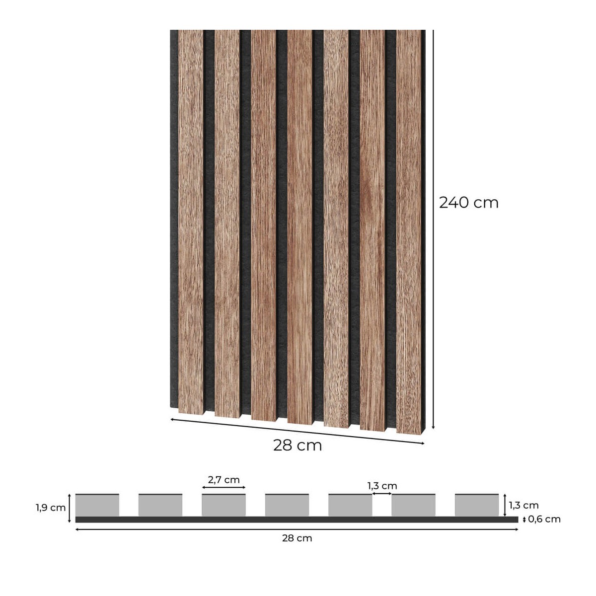 Veneered Acoustic Panels 60 x 240 cm are made of environmentally friendly materials. The panels have acoustic properties and can be used in various public spaces, i.e. offices, as well as in residential buildings. They can be mounted on both walls and ceilings. The 7 mm thick felt, which is available in black or gray, is obtained by recycling plastics. The laths are made of veneered 1-sided slats of 12 mm thick black MDF. The MDF slat is 2400 mm long and 27 mm wide. The black MDF slats are veneered unfinished (not oiled), available in several fashionable colors. The spacing between the slats is 13 mm.